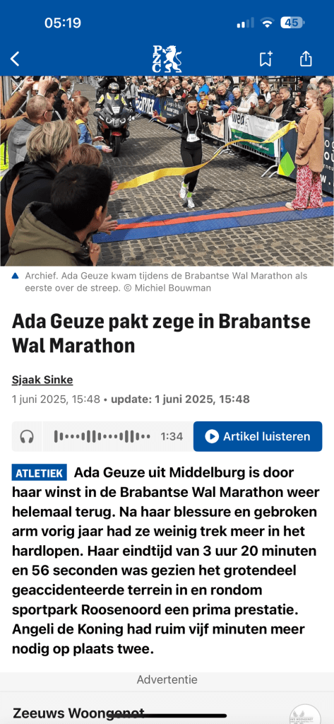 Finish: Na drie uur en twintig minuten passeerde ik als eerste dame de finish van de Brabantse Wal Marathon. Er werd door de organisatie niet echt acht op geslagen, maar voor het gevoel stak ik beide armen wel even de lucht in toen ik de finish passeerde. Een gevoel van ongeloof en blijdschap! Dit was totaal niet het idee van mijn inschrijving voor deze marathon. Wat bedoeld was als een lange duurloop, eindigde in een marathonzege. En dat terwijl ik me precies aan m’n raceplan had gehouden. Ik had genoten en ik had niet gepusht. Missie geslaagd! In de kleedkamer werd ik gebeld door de reporter van Omroep Zeeland die het bericht van mijn overwinning al had vernomen. Even daarna stond er al een leuk stukje op de website geplaatst. Heel leuk! Na de huldiging op het podium genoten we nog van een hapje en een drankje en was het weer tijd om naar huis te gaan.